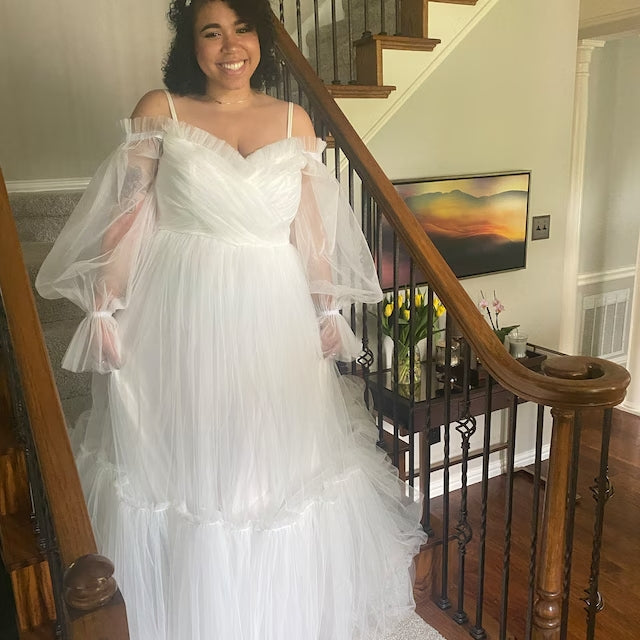 A bouncy dress in soft mesh on a corset with built-in cups and puffy sleeves that are dropped but can be draped over the shoulders if desired! At the bottom of the skirt, there is additionally a row of ruffles for volume, which does not burden the style of the dress, but on the contrary makes it romantic! The dress has a hidden zip and laces on the back to adjust the size to ensure a perfect fit on any body shape!